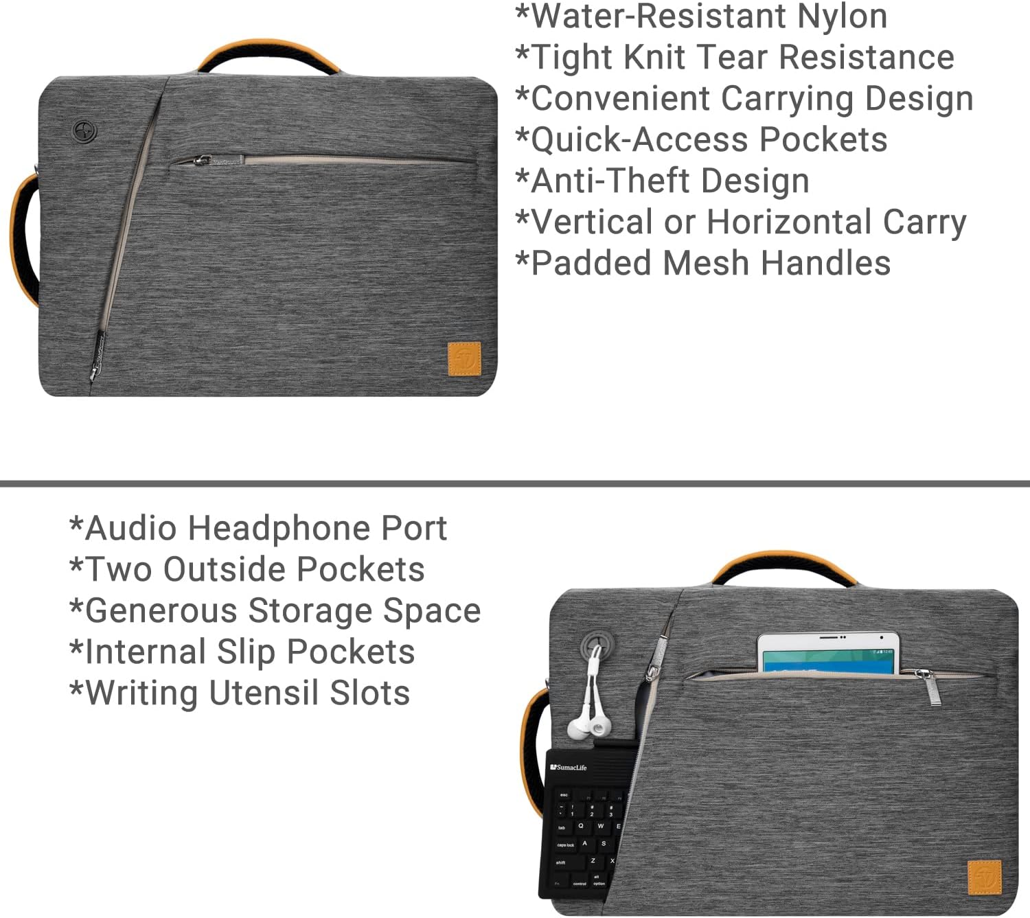 • [ EXTERIOR FEATURES ]- The outside of the bag is wrapped in a durable water-resistant Nylon that holds up effortlessly to everyday use. The front of the bag features 2 large zippered compartments for storing multiple items; inside one of the compartments are 2 slip pockets and 2 writing utensil slots for added organization.